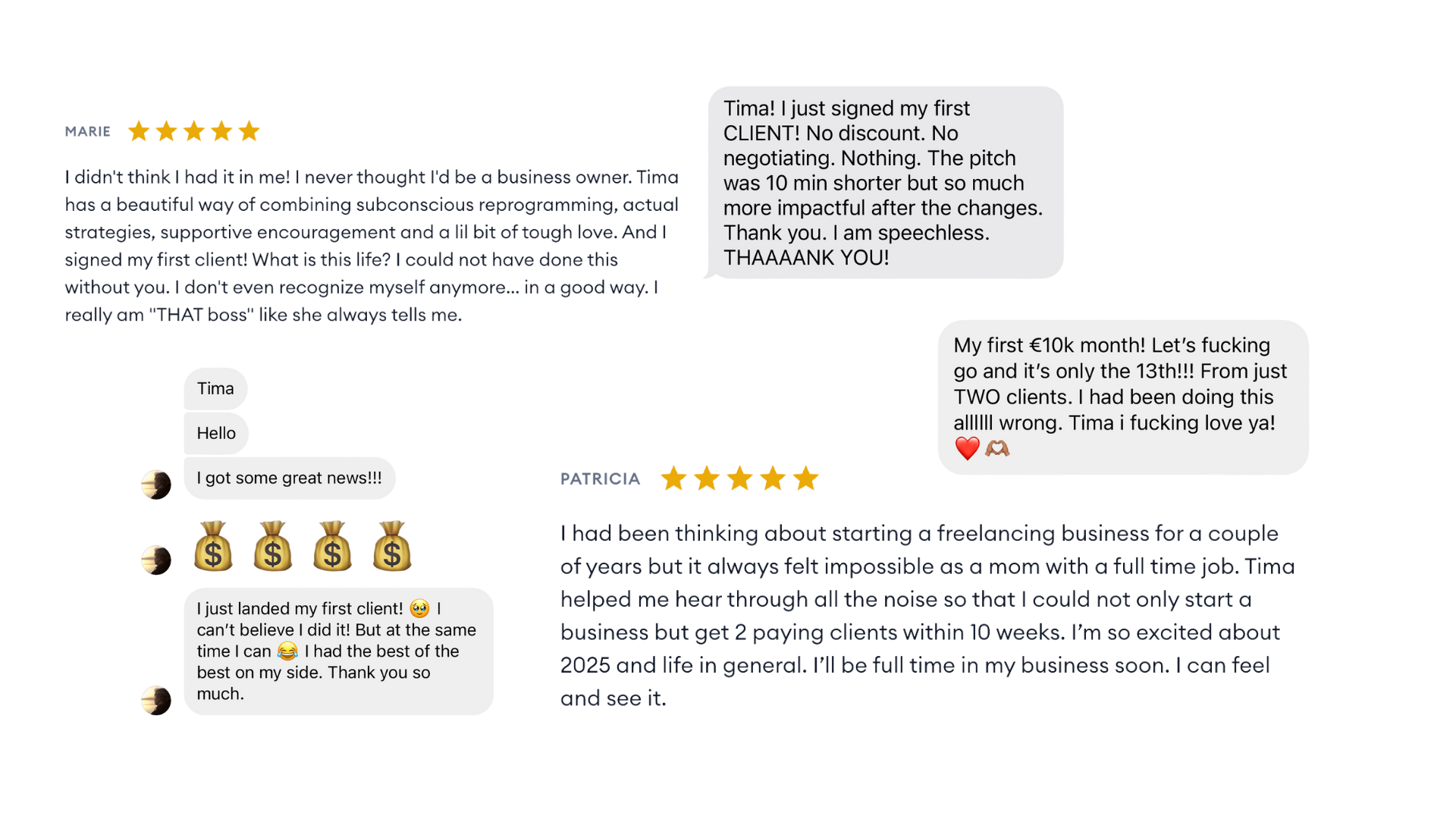 I was scared to price higher, but with Tima’s framework I set my first premium rate... and a client paid in full within a week..